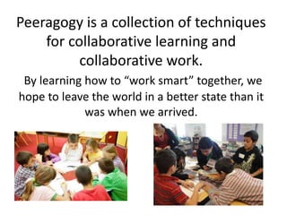 The document discusses peeragogy, a set of techniques aimed at fostering collaborative learning and peer-assisted education. It emphasizes the importance of motivation, new literacies, and skill refinement in the context of contemporary education and teamwork, encouraging the use of various digital tools for communication and collaboration. The document also highlights the transformation of knowledge retention and communication methods in the information age, recommending specific applications for educators and teams to enhance collaborative learning experiences.