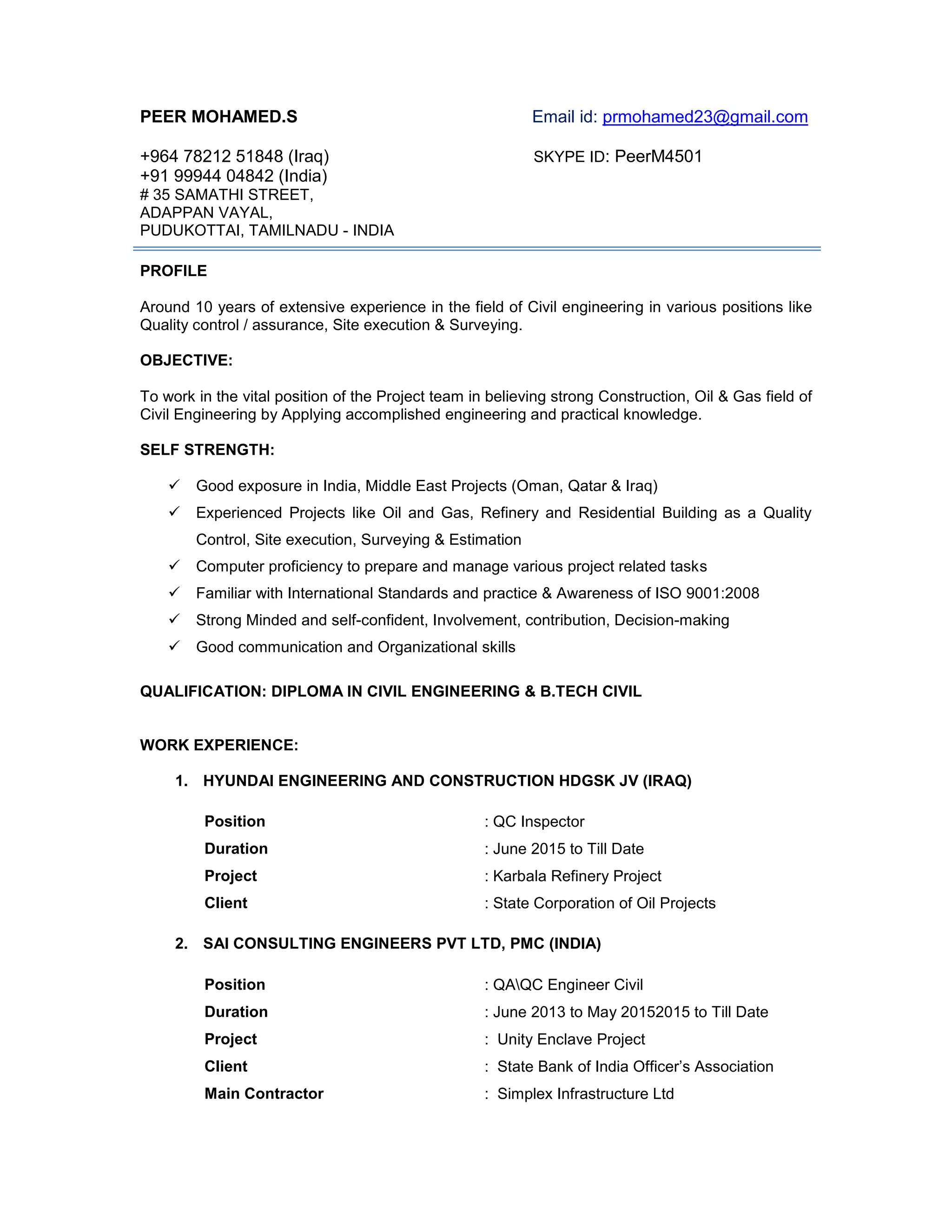 Peer Mohamed has over 10 years of experience in civil engineering projects in India, the Middle East, and Iraq. He has worked on various projects in quality control, site execution, surveying, and estimation. He holds a Diploma in Civil Engineering and a B.Tech in Civil Engineering. Peer is seeking a position as part of a project team where he can apply his engineering and practical knowledge to construction and oil and gas projects. He has skills in quality assurance, planning, scheduling, coordination, and computer-aided design.