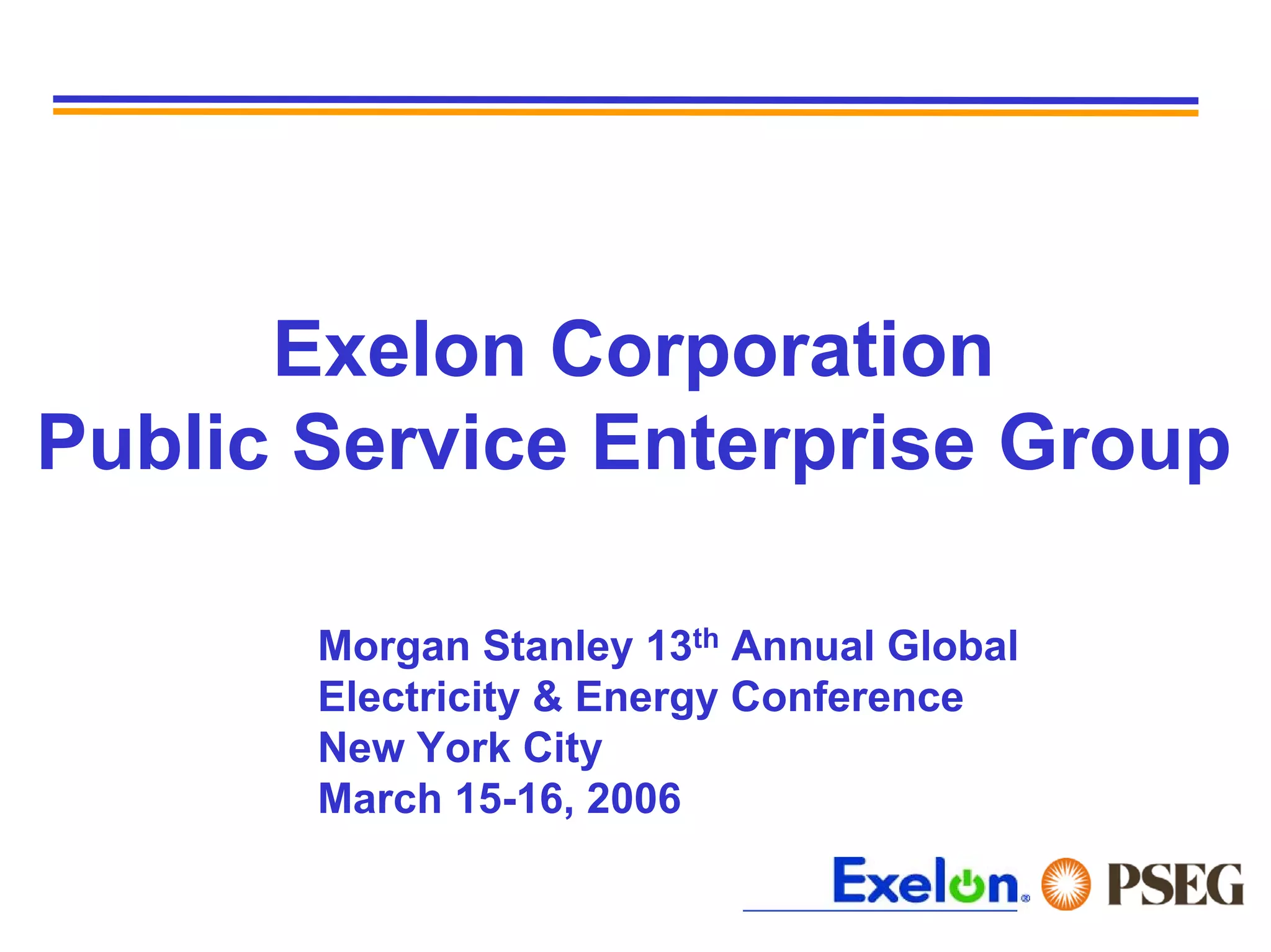 Exelon Corporation and Public Service Enterprise Group provided an overview of their 2005 performance and 2006 outlook at the Morgan Stanley 13th Annual Global Electricity & Energy Conference. Key points included: - Both companies reported strong standalone performance in 2005 and expect continued growth in 2006 driven by improving power markets and operations. - The proposed merger between Exelon and PSEG is progressing towards closing in the second or third quarter of 2006 and would create a uniquely positioned generation business with a large, low-cost nuclear fleet. - Exelon's 2005 earnings growth was driven by improved operations and commodity risk management. It expects further earnings growth in 2006 and 2007 from the end of below-market contracts and recontract