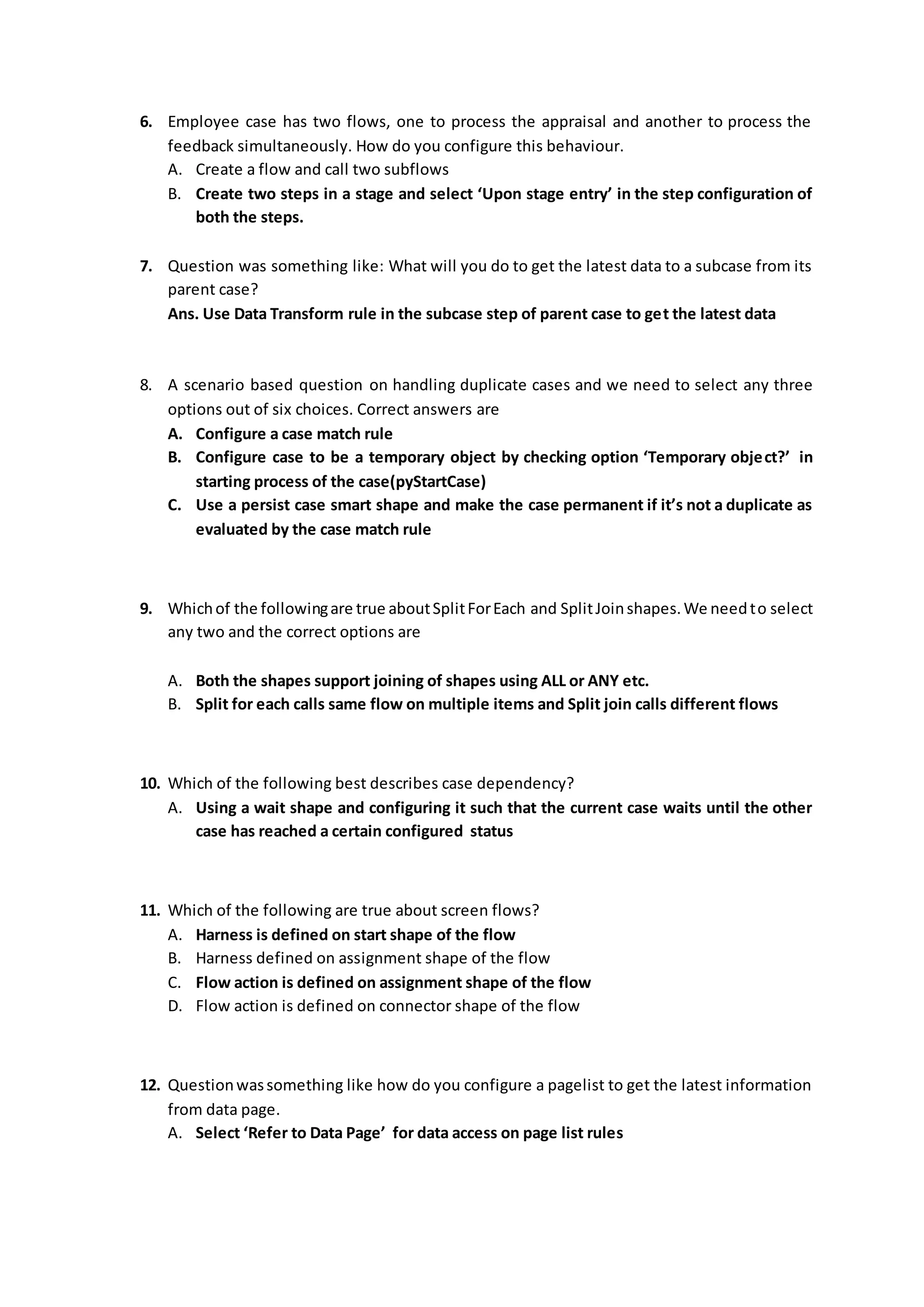 This document provides a set of questions and answers related to the Pega CSSA 7.1 certification exam. It discusses topics like which field is not mandatory when creating a new application, how to configure locking on a subcase, how to configure parallel flows for appraisal and feedback processing, and how to get latest data from a parent case to a subcase. The questions cover a range of Pega concepts including rules, cases, flows, data integration, and more. The document is intended to help candidates prepare for the CSSA exam by providing sample questions and answers to study.