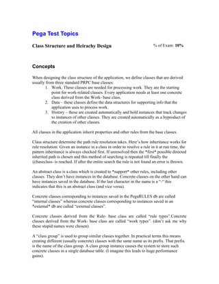 The document discusses the structure and hierarchy design of class definitions in Pega, focusing on three main class types: work classes for processing tasks, data classes for data structures, and history classes for tracking changes. It explains the inheritance and rule resolution process, distinguishing between abstract and concrete classes, as well as class groups, work objects, and work pools. This overview highlights how these components interact to optimize application performance and organization.