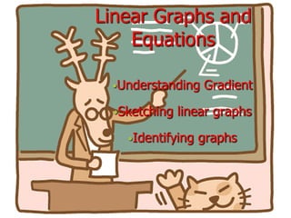 The document discusses linear equations and graphs. It defines a linear equation as one where the variables each have an exponent of 1 and are only added or subtracted. It then identifies which of several example equations are linear based on this definition. The document explains that the graph of a linear equation is a straight line. It shows how to graph linear equations by making tables of values and plotting points. It also discusses how to graph vertical and horizontal lines when there is only one variable. Finally, it covers finding the equation of a line given its slope and y-intercept, or two points on the line.
