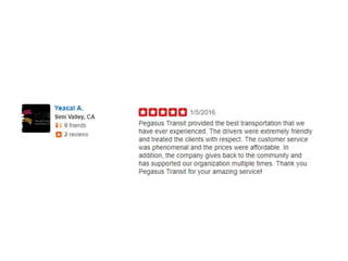 Pegasus Transit Inc. is Ventura County's leading provider of private transportation, specializing in affordable group airport transfers using various shuttle options. They offer services for events such as weddings, field trips, and corporate events, with a focus on safety and customer service. Their fleet includes charter buses, shuttle vans, and more, serving areas including Ventura, Oxnard, and Santa Barbara.