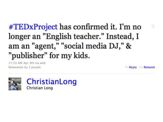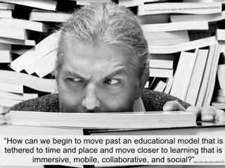 This document discusses how learning is shifting from isolated to connected experiences due to new digital technologies and social media. It notes that today's students see participatory and networked learning as normal. It explores how the internet and mobile technologies have made information more abundant, accessible, and collaborative. It highlights new opportunities for open educational resources, online communities, and personalized learning experiences that are no longer constrained by geography. The future of learning is projected to involve greater personalization, real-time collaboration, and opportunities for everyone to teach and learn from each other through open sharing of ideas.