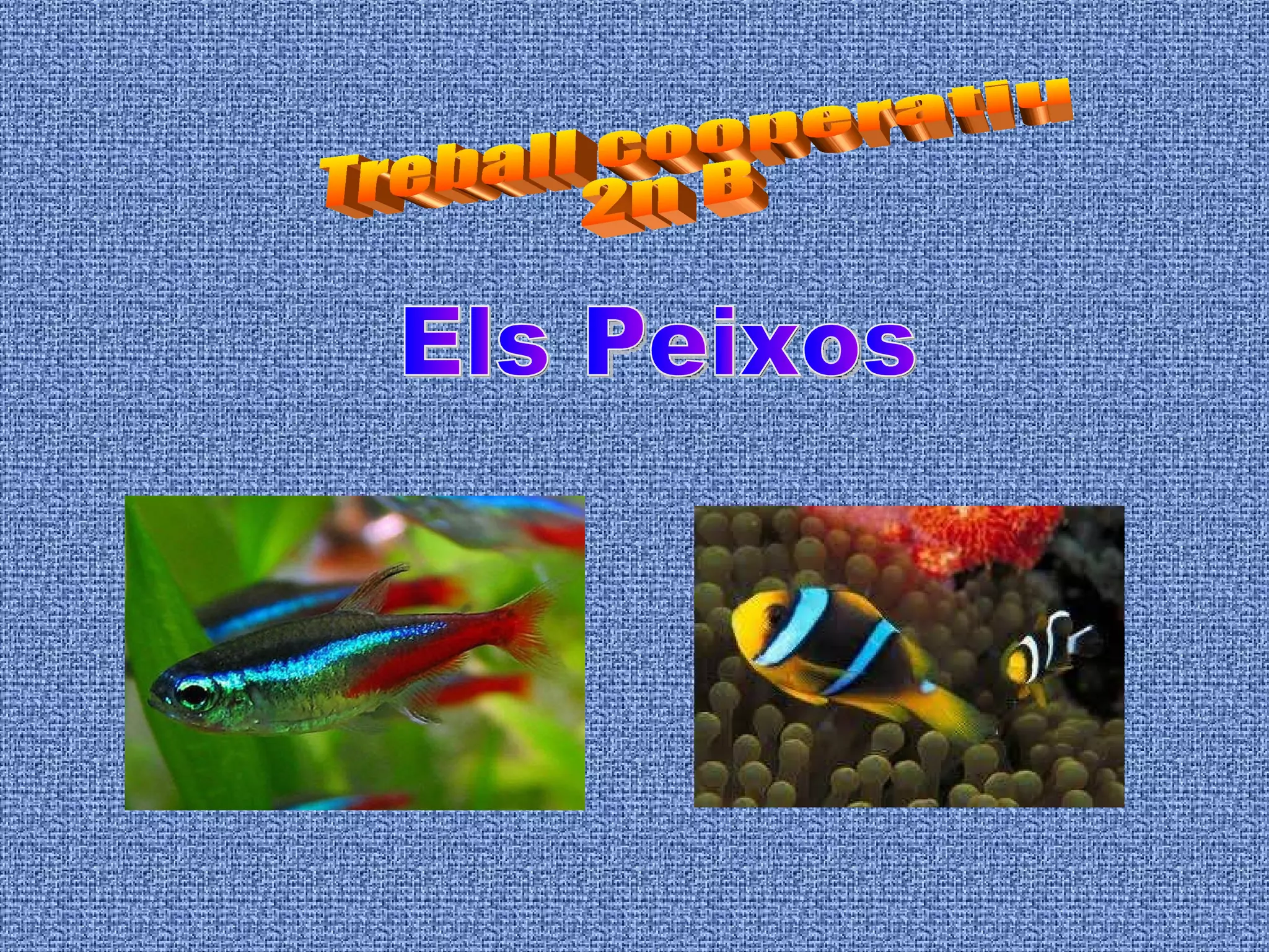 Els peixos sónel grup més antic de vertebrats i s’han adaptat molt bé al medi en que viuen. Hi ha dos grups de peixos, un amb esquelet ossi i brànquies per respirar i un altre grup més reduït que tenen un esquelet cartilaginós com els taurons.