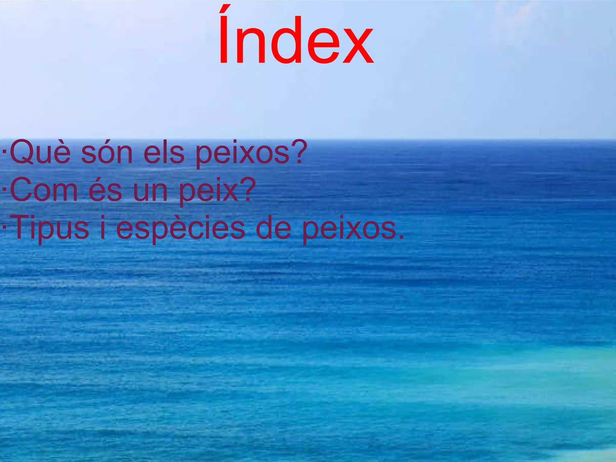 Índex ·Què són els peixos? ·Com és un peix? ·Tipus i espècies de peixos.