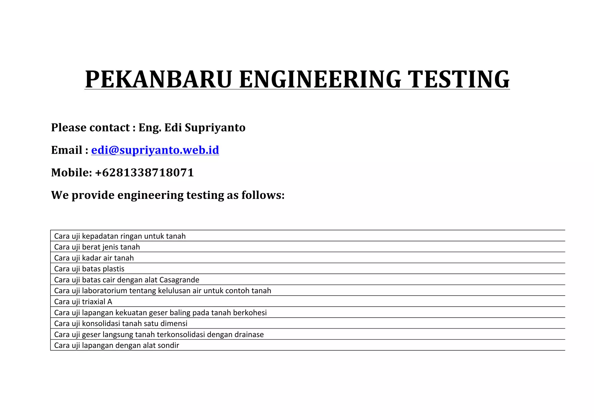 This document provides contact information for Pekanbaru Engineering Testing and lists various types of engineering tests they provide, including soil testing methods, concrete testing methods, aggregate testing methods, and foundation and geotechnical field testing services. Their tests cover properties of soils, aggregates, concrete, asphalt and other construction materials. They also offer various field testing services for foundations, geotechnical investigations and groundwater monitoring.