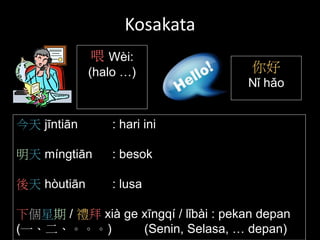 Dokumen ini terdiri daripada pelajaran Bahasa Mandarin tentang kosa kata serta ungkapan berkaitan panggilan telefon. Ia meliputi frasa untuk menanyakan waktu kosong, tujuan panggilan, serta percakapan contoh di antara beberapa individu. Penekanan juga diberikan pada jenis makanan yang dibincangkan dalam dialog.
