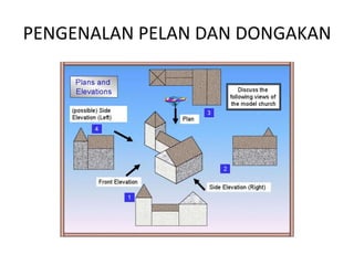 Dokumen ini memberikan panduan tentang pelan dan dongakan bentuk 3 dimensi seperti kiub, kuboid, dan silinder, serta cara melukis unjuran ortogon pada pelan mengufuk dan pandangan sisi. Persyaratan yang perlu diperhatikan termasuk penggunaan garisan tebal untuk sisi kelihatan dan garisan putus-putus untuk sisi tidak kelihatan. Terdapat juga aktiviti pengayaan untuk mengubah bentuk 3 dimensi dan melukis unjuran dari berbagai pandangan.