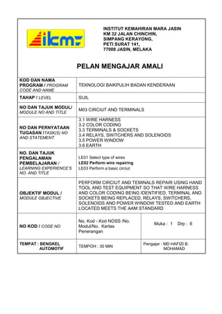 Dokumen ini berisi rancangan pelajaran amali untuk modul "Circuit dan Terminals" dalam program Teknologi Baikpulih Badan Kenderaan di Institut Kemahiran Mara Jasin. Rancangan ini memberikan panduan kepada pengajar untuk mengajar tentang penyambungan wayar, kod warna, terminal dan soket, relay, switch dan solenoid, tingkap kuasa, dan bumi. Pelajaran ini akan dilaksanakan selama 30 minit dan meliputi aktiviti praktikal seperti memilih dan