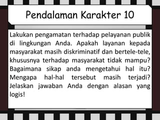 Kelompok membahas pelayanan publik di Indonesia dan menyoroti diskriminasi serta kesulitan akses bagi masyarakat tidak mampu, terutama dalam bidang pendidikan dan kesehatan. Dasar hukum dan prinsip pelayanan publik, seperti transparansi dan akuntabilitas, dijelaskan untuk menekankan pentingnya pelayanan yang adil dan tidak diskriminatif. Masalah yang dihadapi termasuk rendahnya kualitas layanan dan perlunya sosialisasi serta pengawasan yang lebih baik.