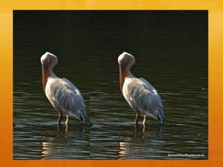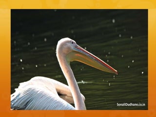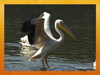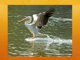 This document describes a large, squat, grey and greyish white water bird with short, stout legs, large webbed feet, and a heavy flattened bill. It hunts in flocks, driving fish into shallows by splashing its wings and scooping the fish into an elastic pouch under its bill. From November to April, it nests in large stick platforms built far from water, with several nests in the same tree.