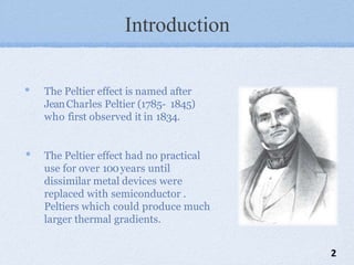 The document presents a mini project on the Peltier device as a thermoelectric cooler, detailing its principles, construction, and applications. It discusses the Peltier effect, which allows for temperature gradients through semiconductor technology, and reviews various studies and relevant literature on the subject. The document further analyzes the performance of Peltier modules using MATLAB simulations and outlines their pros and cons.