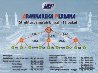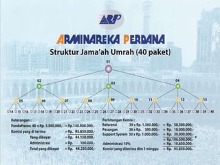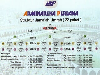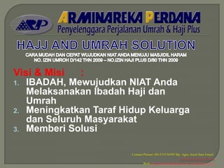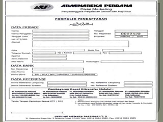 Dokumen ini menjelaskan persyaratan dan prosedur untuk berangkat haji dan umrah, termasuk biaya, pembayaran, serta kontak untuk informasi lebih lanjut. Terdapat penjelasan tentang cara meringankan biaya melalui cicilan dan dukungan dari beberapa bank. Selain itu, informasi tentang syarat dan ketentuan juga disertakan untuk calon jamaah.