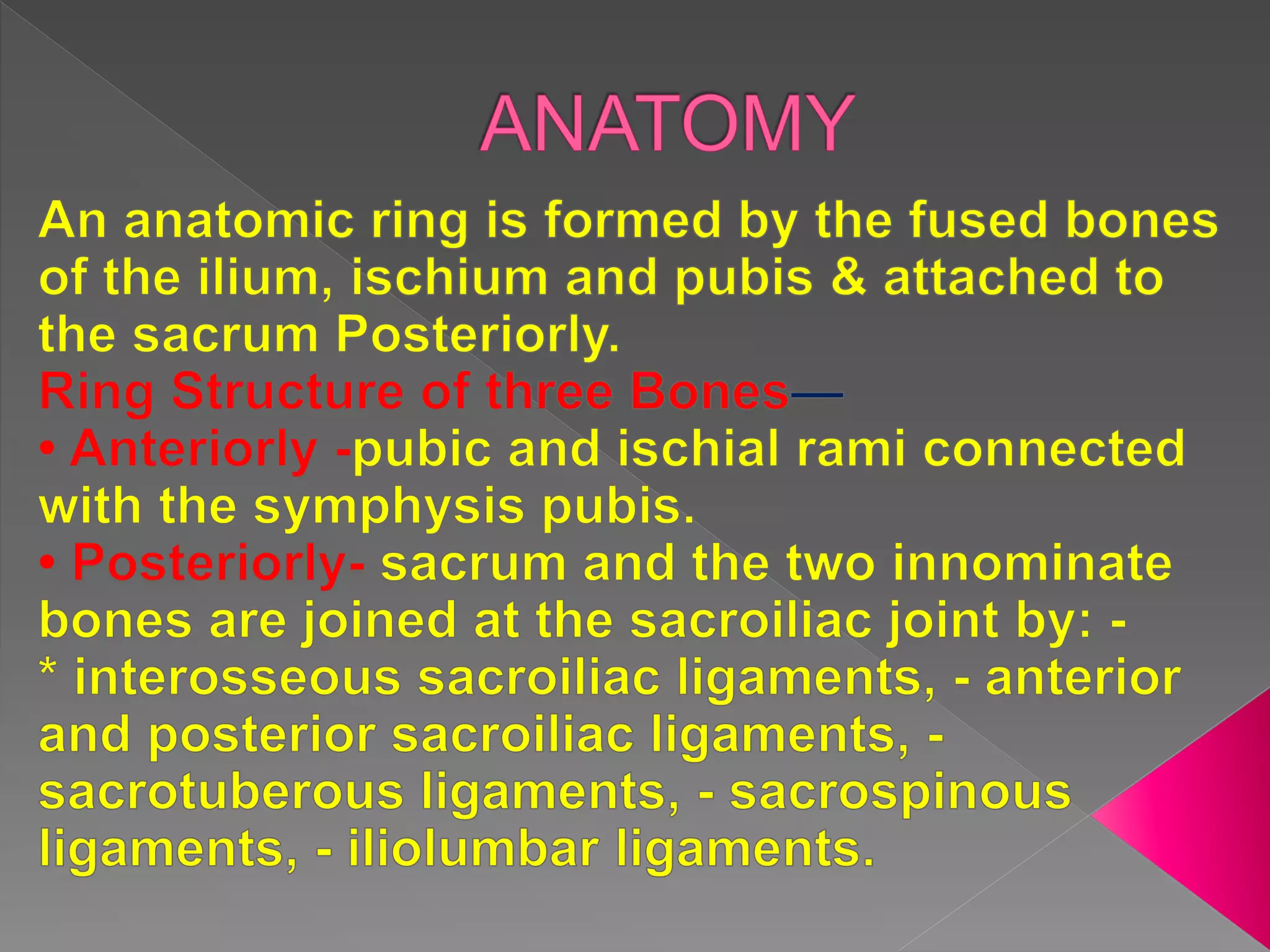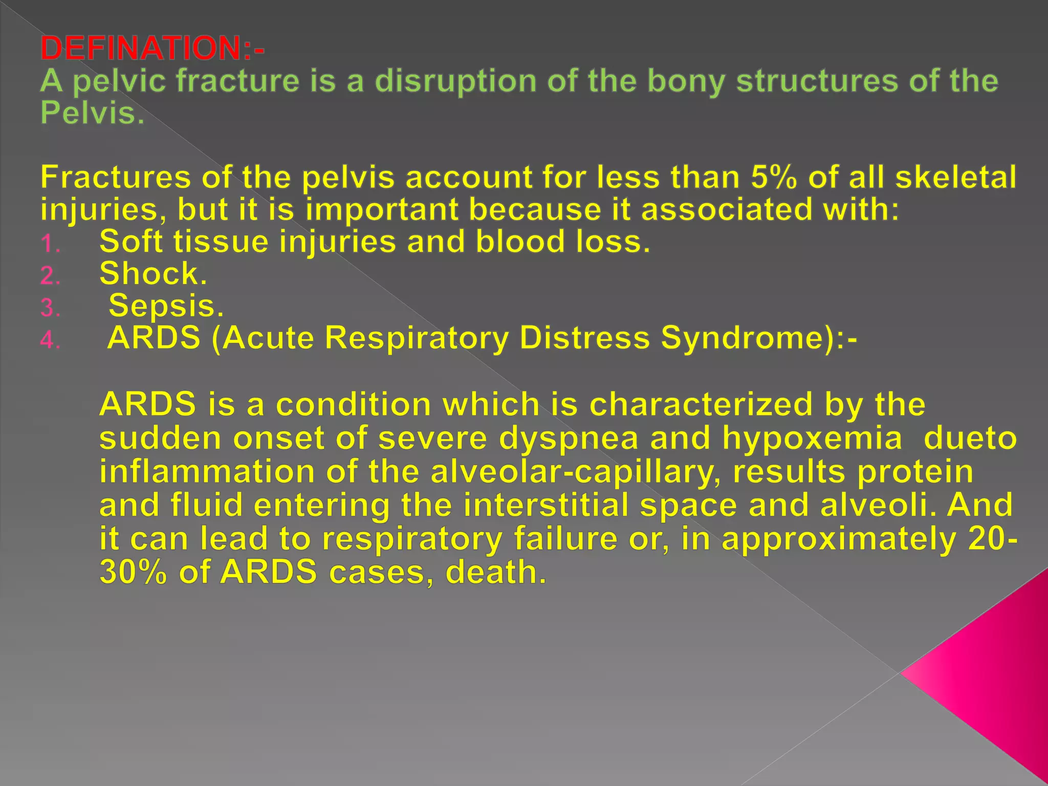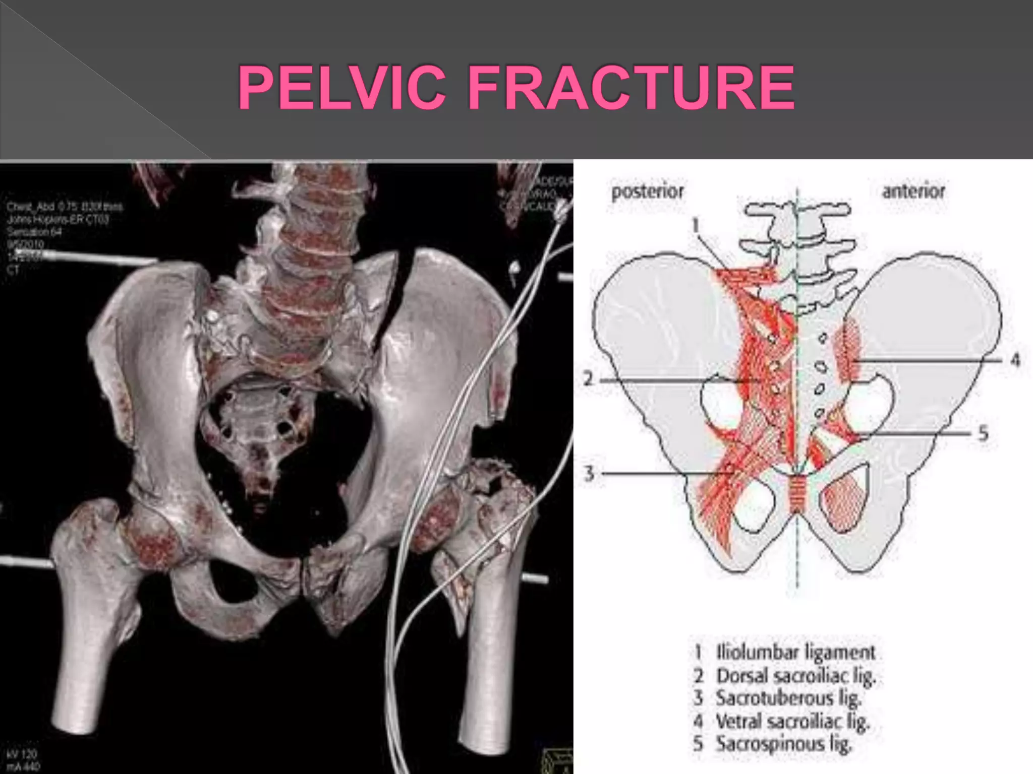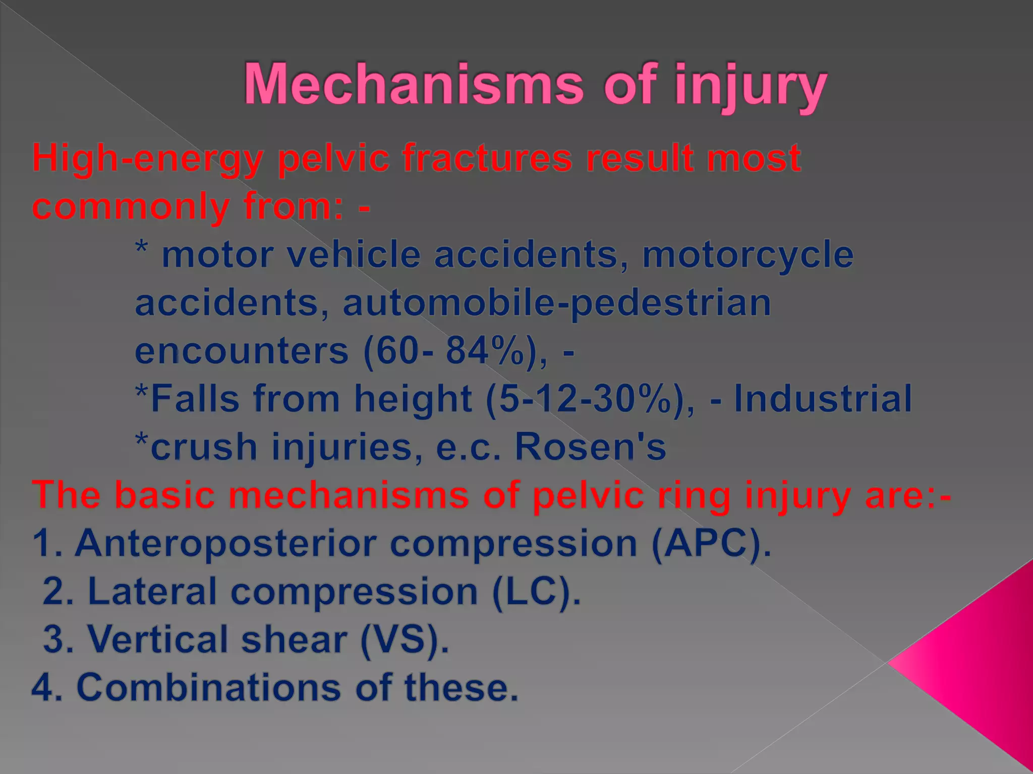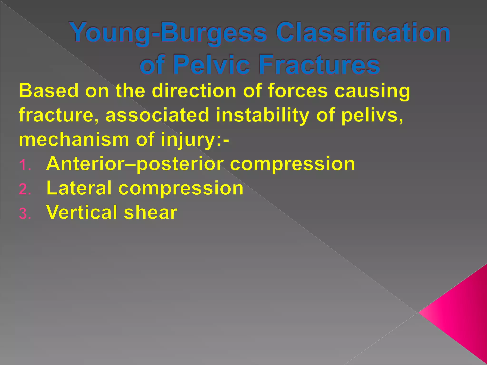 The document outlines various types of pelvic injuries categorized by anterior-posterior compression and lateral compression mechanisms. It details three progressive types of APC injuries (I, II, III) based on the severity of symphysis widening and associated injuries, as well as three levels of lateral compression injuries (I, II, III) involving fractures and dislocations. Each type indicates specific injuries to pelvic structures and the forces involved in their occurrence.