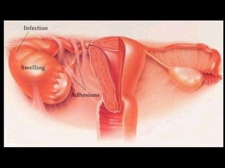 Pelvic inflammatory disease (PID) is an infection of the female reproductive organs including the uterus, fallopian tubes, and ovaries. It is commonly caused by bacteria like Chlamydia and gonorrhea spreading from the vagina or cervix. Symptoms include lower abdominal pain and bleeding between periods. Without treatment, PID can lead to long-term complications such as infertility or ectopic pregnancy. Treatment involves antibiotics, sometimes administered intravenously in severe cases. Prevention focuses on screening and treatment of sexually transmitted infections.