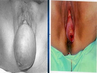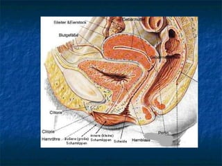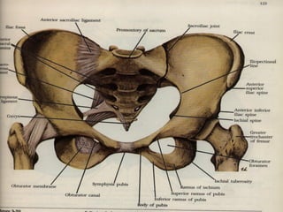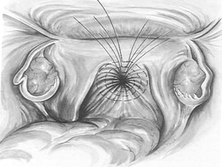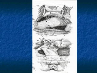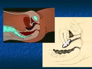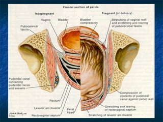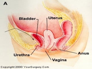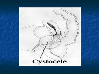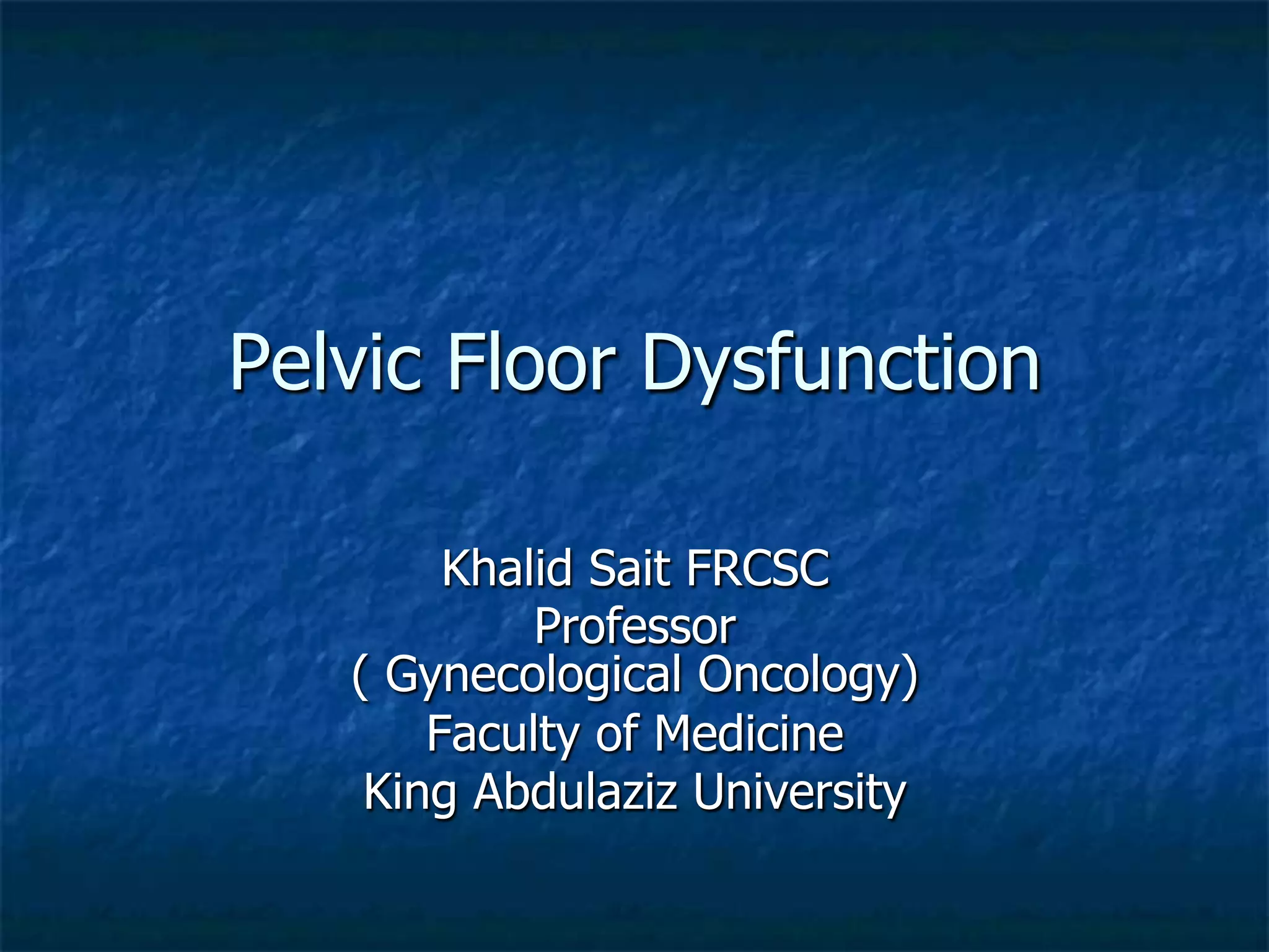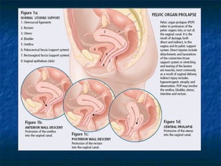 This document discusses pelvic floor dysfunction and pelvic organ prolapse. It begins by describing normal pelvic anatomy including ligaments, tendons, fascia and muscles that provide support. Three levels of vaginal support are identified. Pelvic organ prolapse is then defined as the protrusion of pelvic organs into or outside the vaginal canal. Etiology and risk factors for pelvic organ prolapse are outlined. Assessment, symptoms, and conservative and surgical management options are reviewed for anterior, posterior, and apical prolapse. Surgical procedures including anterior and posterior colporrhaphy, paravaginal repair, and abdominal, laparoscopic and vaginal vault suspension techniques are described.