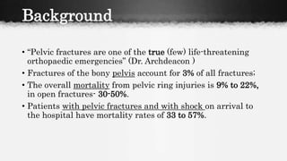 Pelvic fractures can be life-threatening injuries that require prompt treatment. They account for 3% of all fractures and mortality is as high as 22% depending on the severity of the injury. The pelvis forms a ring structure connecting the sacrum to the two innominate bones. High-energy impacts from motor vehicle accidents are the most common causes of pelvic fractures. Tile and Young-Burgess classifications are used to characterize the fractures and guide treatment. Unstable fractures with hemorrhage require emergency stabilization, usually with an external fixator or pelvic binder, and fluid resuscitation to prevent hypovolemic shock.