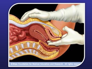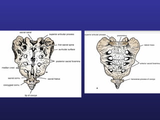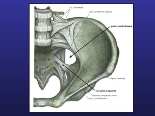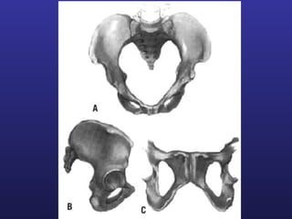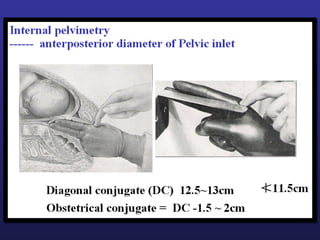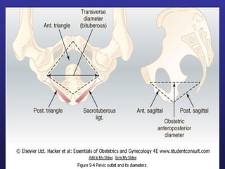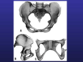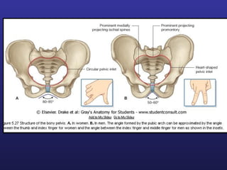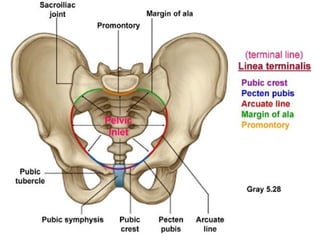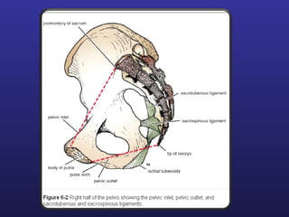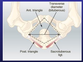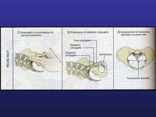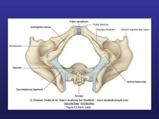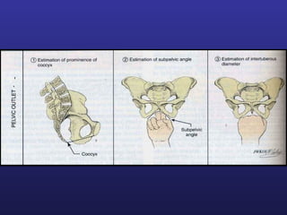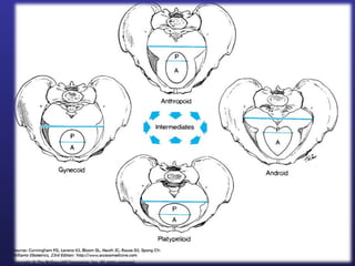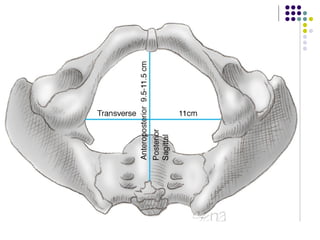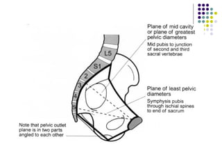 This document discusses female pelvis anatomy and pelvimetry. It describes the bones that make up the pelvis, including the sacrum, coccyx, hip bones and pubis. It outlines the pelvic inlet, cavity, and outlet, including their boundaries and diameters. The pelvic planes and axes are defined. Finally, it briefly mentions pelvic types and the process of pelvimetry.