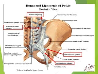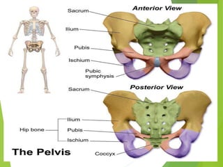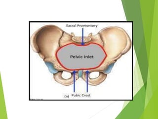 The female pelvis is adapted for childbirth with an increased width and rounded brim. It is formed by the two innominate bones, sacrum, and coccyx. Each innominate bone consists of the ilium, ischium, and pubic bone. The pelvis contains four joints - two sacroiliac joints, the pubic symphysis joint, and the sacrococcygeal joint. The pelvis has three regions - the brim, cavity, and outlet. The brim is rounded and its diameters include the anteroposterior, transverse, and oblique. There are four main pelvic types - gynaecoid, anthropic, android,