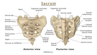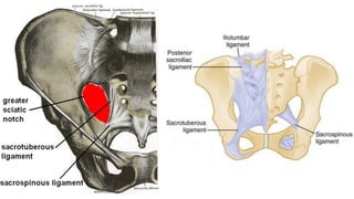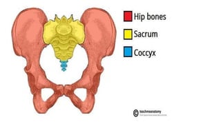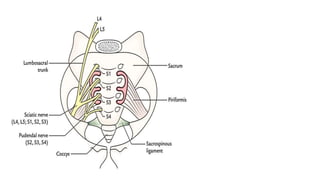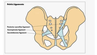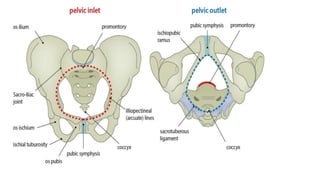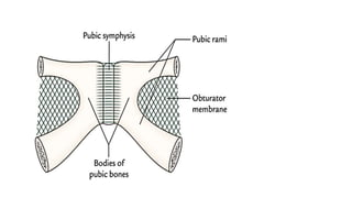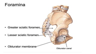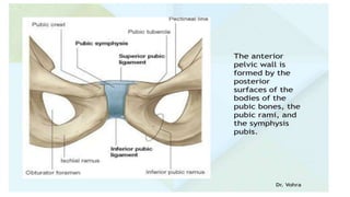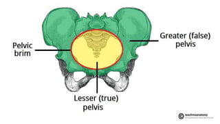 This document provides an overview of the pelvis. It describes the pelvis as a bowl-shaped bony structure containing important organs and forming attachments for the trunk and lower limbs. The pelvis is formed from four bones: the two hip bones, sacrum, and coccyx. It is divided into the false pelvis above the pelvic brim and true pelvis below. The true pelvis has an inlet, outlet, and cavity to allow childbirth. The anterior, posterior, and lateral walls of the pelvis are described along with important ligaments and muscles that provide structure and support.