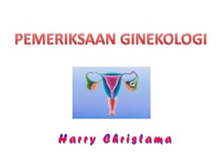 Dokumen ini menjelaskan langkah-langkah dalam pemeriksaan ginekologi pasien, yang mencakup anamnese, pemeriksaan fisik, dan pemeriksaan penunjang. Ia juga menyoroti keluhan umum serta riwayat ginekologi dan obstetri yang penting untuk diagnosis. Pemeriksaan tambahan seperti laboratorium dan imaging juga disebutkan untuk mendukung evaluasi kesehatan ginekologi.
