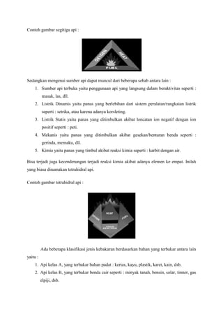 Pemadam kebakaran adalah petugas yang dilatih untuk memadamkan api dan menyelamatkan korban dari kebakaran dan kecelakaan. Mereka memakai pakaian khusus anti-api dan dilatih dalam berbagai teknik penanganan darurat. Sistem penanggulangan kebakaran meliputi perencanaan struktur, evakuasi, komunikasi, dan pemeliharaan peralatan untuk mencegah dan menangani kebakaran.