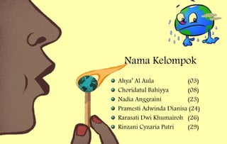 Dokumen ini membahas pemanasan global yang disebabkan oleh peningkatan gas rumah kaca dari aktivitas manusia, yang menyebabkan perubahan iklim, kenaikan permukaan laut, dan dampak negatif pada kehidupan hewan dan kesehatan manusia. Untuk mengatasi masalah ini, diperlukan pengurangan emisi, penggunaan energi alternatif, dan kerja sama internasional melalui perjanjian seperti Protokol Kyoto dan UNFCCC. Kebijakan untuk menanam pohon dan memanfaatkan sumber energi ramah lingkungan adalah langkah-langkah konkret yang dapat diambil.