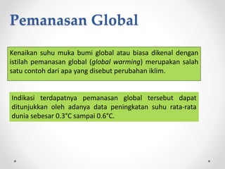 Dokumen ini membahas pemanasan global yang ditandai dengan kenaikan suhu global 0.3°c hingga 0.6°c akibat aktivitas manusia seperti penggunaan bahan bakar fosil dan pembakaran hutan. Pemanasan global berpengaruh pada tata ruang melalui mencairnya es kutub yang menyebabkan kenaikan permukaan laut dan perubahan iklim, serta menyebabkan bencana alam seperti kebanjiran dan kekeringan. Upaya pencegahan meliputi pengurangan emisi, perlindungan lingkungan, dan perencanaan tata ruang yang berwawasan lingkungan.