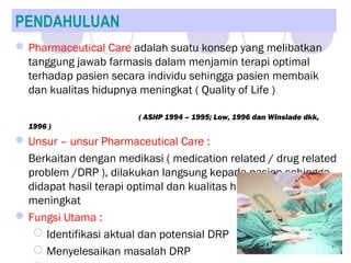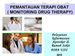 Dokumen tersebut membahas tentang pemantauan terapi obat yang meliputi identifikasi masalah penggunaan obat pasien, evaluasi efektivitas dan keamanan terapi obat, serta rekomendasi perubahan terapi jika diperlukan untuk mencapai hasil terapi yang optimal.