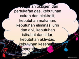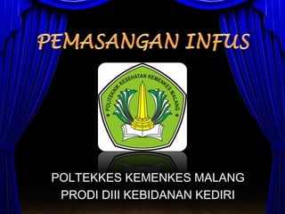 Dokumen ini membahas tentang pemenuhan kebutuhan cairan dan elektrolit pada manusia, serta teknik pemberian cairan intravena untuk mengatasi dehidrasi dan menjaga keseimbangan elektrolit. Penjelasan juga mencakup jenis-jenis larutan infus, langkah-langkah infus, serta perhatian yang harus diambil untuk mencegah komplikasi. Informasi terkait prosedur penggantian botol dan slang infus serta penghentian terapi intravena juga disertakan.