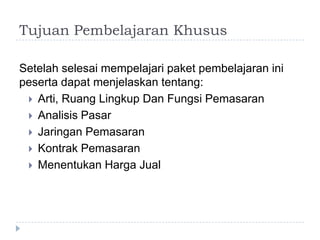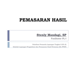 Dokumen ini membahas tentang pemasaran hasil pertanian, termasuk arti, ruang lingkup, dan fungsi pemasaran. Peserta pelatihan diharapkan dapat menganalisis pasar dan menetapkan harga jual berdasarkan berbagai strategi pemasaran dan kontrak. Selain itu, dokumen ini juga mencakup proses pengambilan keputusan dan alat dalam jaringan pemasaran.
