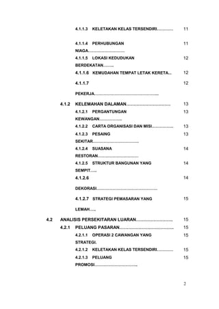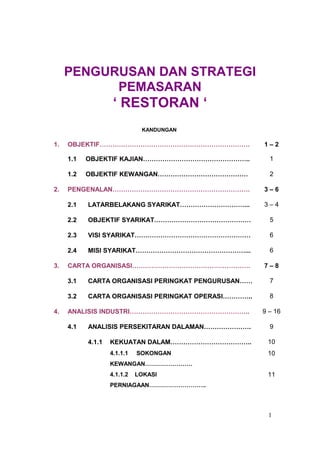 Dokumen ini membahas strategi pemasaran dan pengurusan untuk restoran terapung yang berkonsep masakan laut. Restoran ini berlokasi di taman tasik Shah Alam dan memiliki keunikan konsep terapung serta menu seafood. Dokumen ini menganalisis situasi pemasaran saat ini, sasaran pasar, dan merancang strategi promosi untuk meningkatkan laba sebesar 35% dalam 5 tahun ke depan.