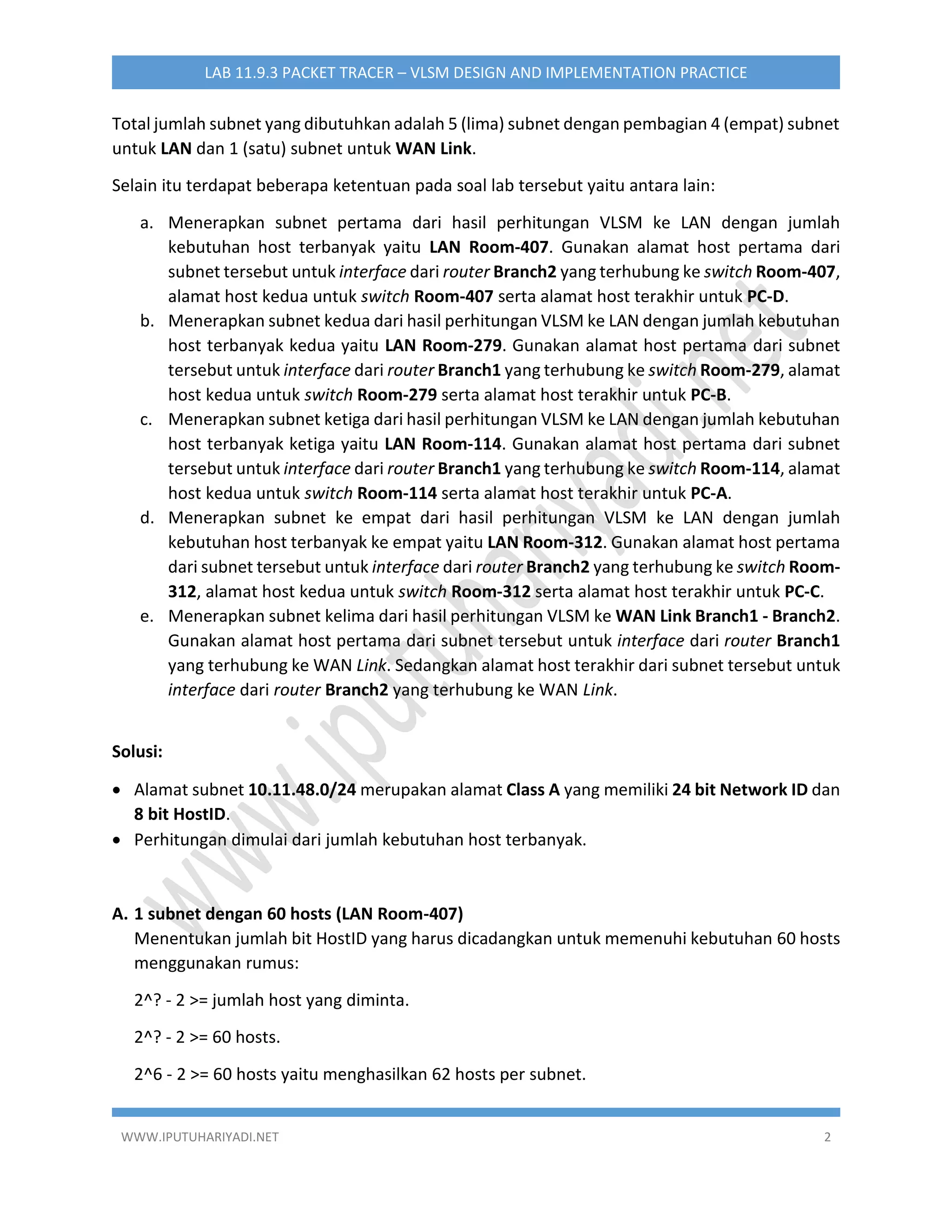 Dokumen ini membahas perhitungan VLSM untuk lab 11.9.3 Packet Tracer sesuai kebutuhan 5 subnet, yaitu 1 subnet untuk 60 host, 1 untuk 30 host, 1 untuk 14 host, 1 untuk 6 host, dan 1 untuk 2 host. Setiap subnet dialokasikan menggunakan alamat 10.11.48.0/24 dengan rincian teknik perhitungan subnetting yang detail dan langkah-langkah untuk menentukan alamat host, broadcast, dan subnet mask yang sesuai. VLSM digunakan untuk mengoptimalkan pengalamatan dalam desain jaringan tersebut.