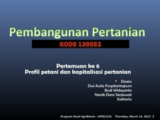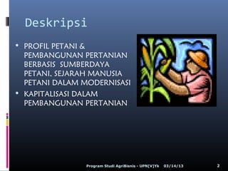 Pertemuan membahas profil petani Indonesia dan strategi peningkatan kapitalisasi pertanian. Petani Indonesia umumnya berpendidikan rendah, lahan sempit, produktivitas rendah. Diperlukan dukungan pemerintah untuk meningkatkan organisasi petani, institusi, dan kapital sosial budaya petani guna meningkatkan pembangunan pertanian.