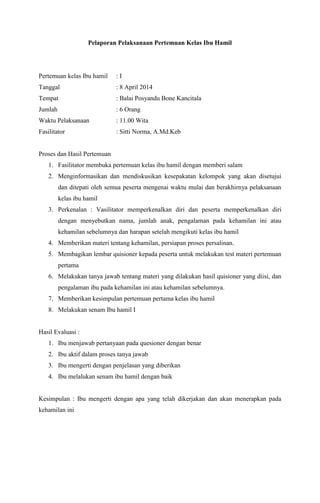 Kelas ibu hamil memberikan edukasi kepada ibu hamil tentang kesehatan selama kehamilan, persiapan persalinan, dan perawatan bayi baru lahir dalam 4 pertemuan. Laporan menunjukkan peningkatan pengetahuan ibu hamil setelah mengikuti kelas tersebut.