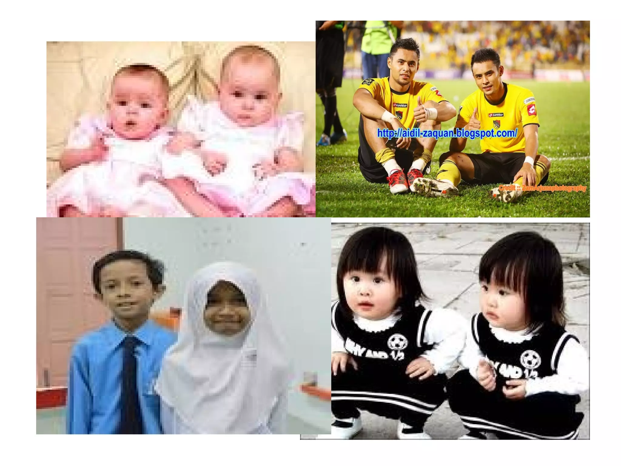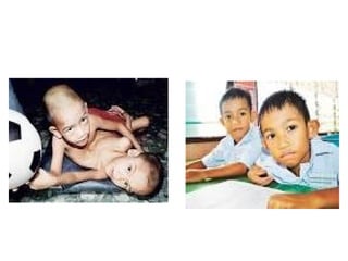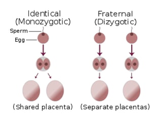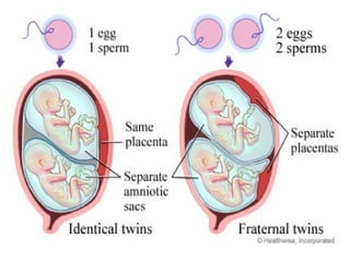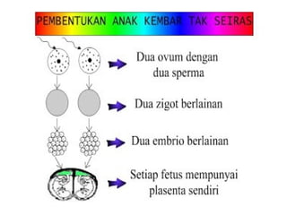 Dokumen ini menjelaskan dua jenis kembar, yaitu kembar seiras dan kembar tak seiras, serta proses pembentukannya. Kembar seiras berasal dari satu ovum yang disenyawakan dan membentuk satu zigot, sementara kembar tak seiras terbentuk dari dua ovum yang disenyawakan oleh dua sperma yang berbeda. Selain itu, dokumen ini juga membahas kembar siam yang merupakan bentuk kembar seiras yang bersambung akibat pembelahan zigot yang tidak lengkap.