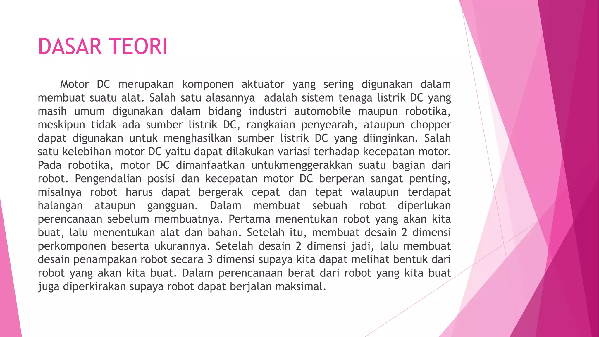 Dokumen ini membahas pembuatan walking robot menggunakan motor DC. Ia menjelaskan dasar teori motor DC dan bagaimana motor DC digunakan untuk menggerakkan robot. Dokumen ini juga menyebutkan alat dan bahan yang diperlukan seperti karton, motor DC, baterai, sakelar, serta langkah-langkah pembuatan robot tersebut yang meliputi perencanaan, perakitan komponen, dan pengujian robot.