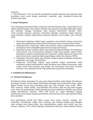 Dokumen tersebut membahas tentang manajemen dan pemeliharaan. Ringkasannya adalah: Manajemen adalah proses perencanaan, pengorganisasian, pengontrolan sumber daya untuk mencapai tujuan secara efektif dan efisien. Pemeliharaan adalah kegiatan untuk memelihara peralatan agar dapat beroperasi dengan baik dan mencapai tujuan produksi.