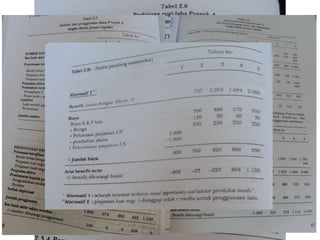 Dokumen tersebut membahas analisis keuangan dalam proses pembiayaan pembangunan. Terdapat beberapa kriteria investasi yang digunakan seperti Net Present Value (NPV), Internal Rate of Return (IRR), Net Benefit-Cost Ratio, dan Gross Benefit-Cost Ratio untuk menilai kelayakan suatu proyek pembangunan. Dokumen ini juga menjelaskan tahapan formulasi, implementasi, operasi, dan evaluasi dari suatu proyek pembangunan.