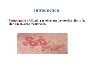 Pemphigus is a rare autoimmune blistering disease of the skin and mucous membranes caused by antibodies against desmoglein proteins. There are three main types - pemphigus vulgaris affects the mouth and skin, pemphigus foliaceus affects the scalp and upper trunk, and paraneoplastic pemphigus is the most severe and associated with cancer. Diagnosis involves biopsy and detecting antibodies. Treatment aims to control the disease and involves high-dose corticosteroids sometimes with steroid-sparing immunosuppressants or other therapies like intravenous immunoglobulins or plasmapheresis.