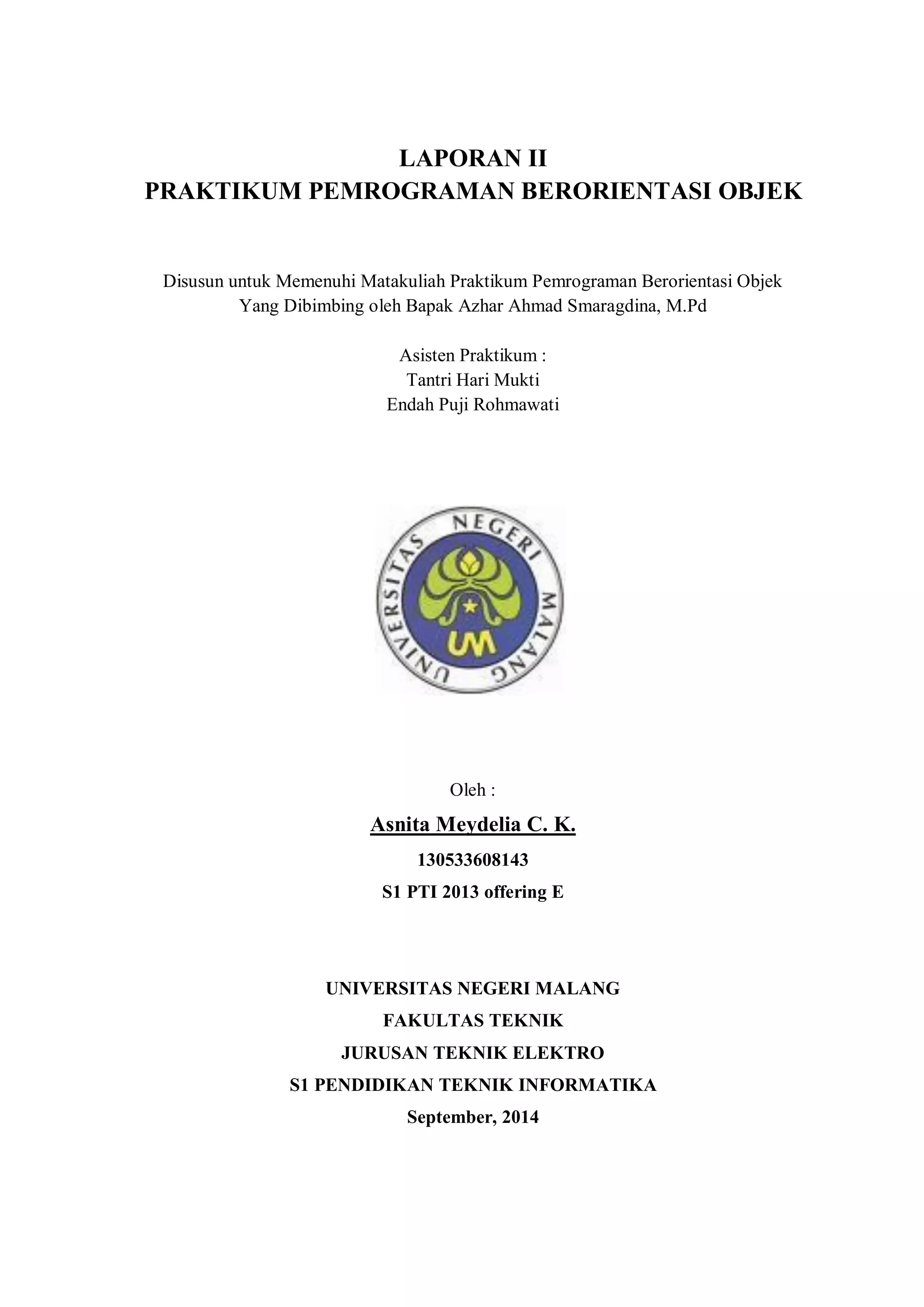 Dokumen ini adalah laporan praktikum pemrograman berorientasi objek yang mencakup pengenalan dasar pemrograman Java, termasuk konsep class, object, dan method overloading. Terdapat berbagai contoh program yang mengilustrasikan penggunaan input/output, serta tugas praktikum dan rumah untuk memperdalam pemahaman mahasiswa. Kesimpulan memuat definisi penting dan penggunaan struktur pemrograman dalam Java.