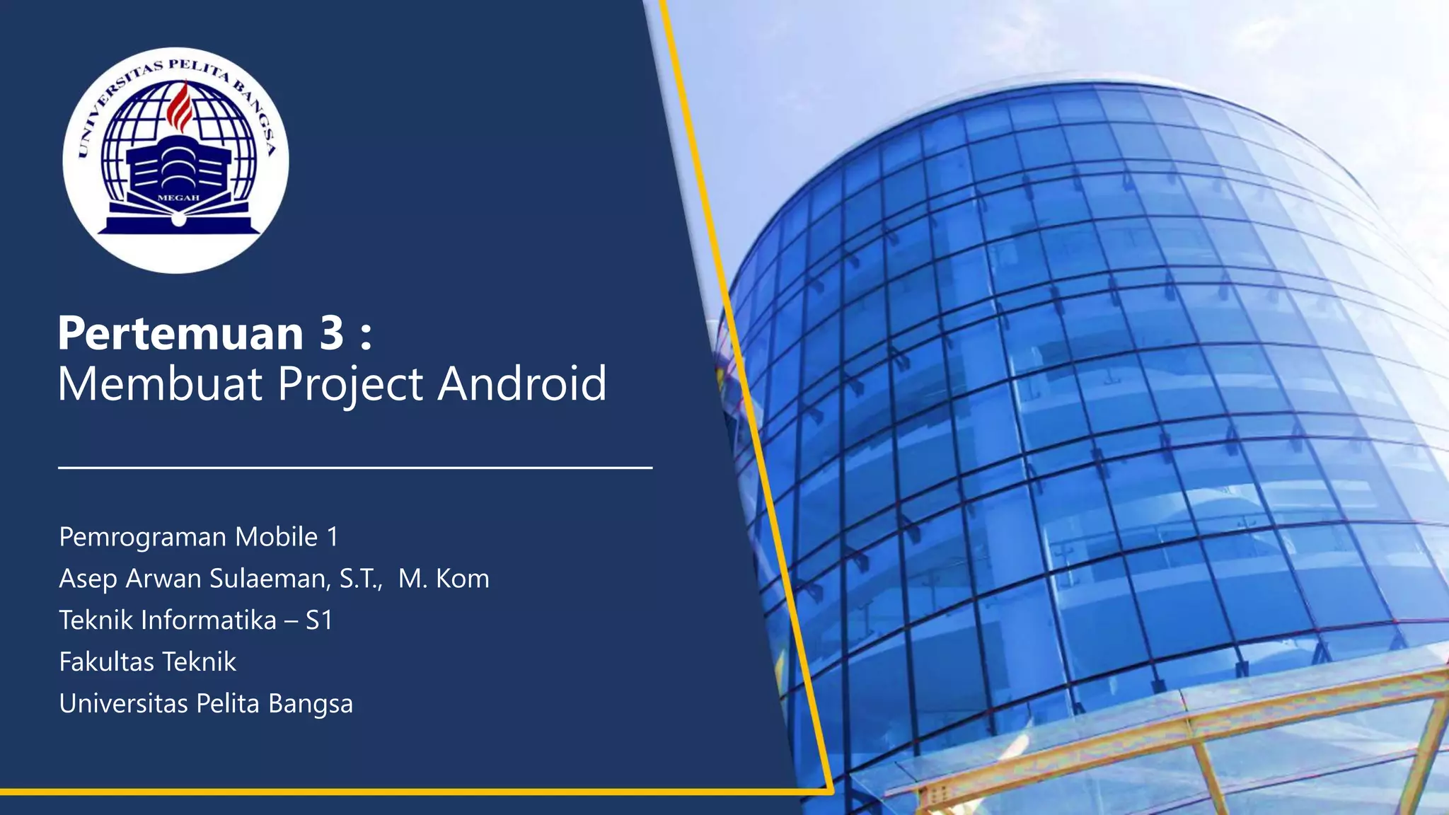 Dokumen ini adalah panduan untuk mahasiswa dalam membuat proyek Android menggunakan Android Studio Dolphin 2021.3.1, termasuk pengenalan menu dan langkah-langkah untuk membuat proyek 'Hello World'. Tujuannya agar mahasiswa menguasai antar muka Android Studio dan proses pembuatan proyek. Selain itu, terdapat latihan yang mengajak mahasiswa untuk membuat makalah dan tutorial terkait materi yang telah dipelajari.