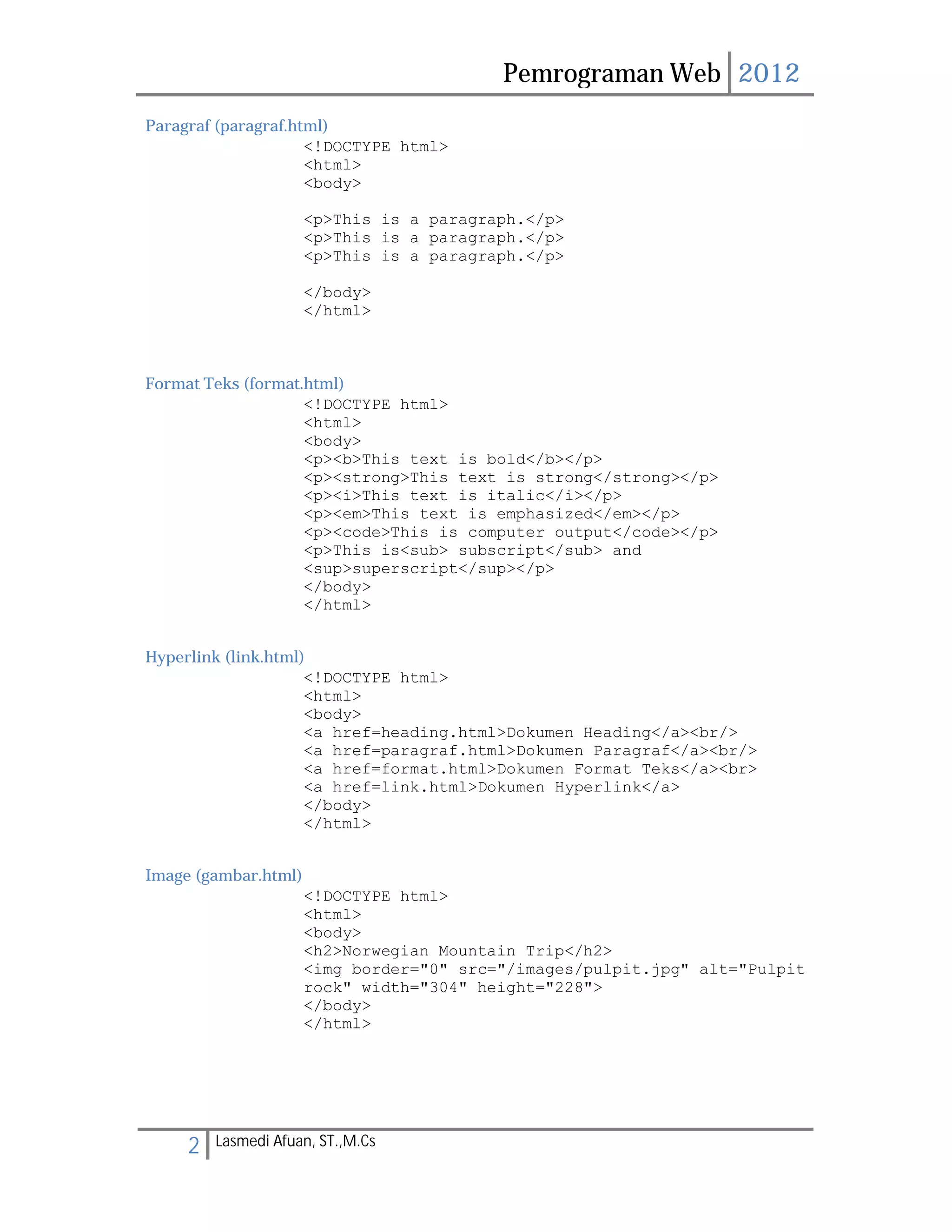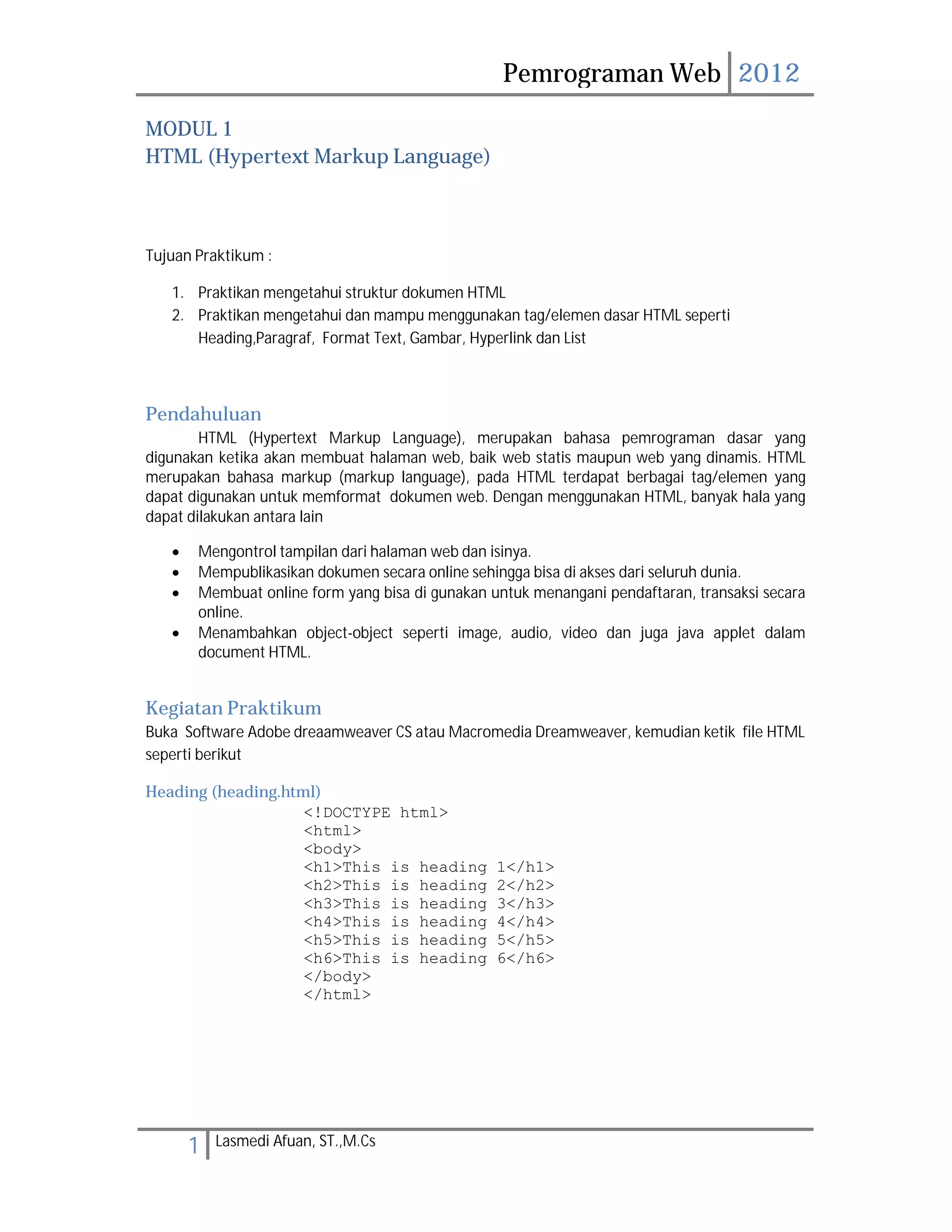 Dokumen ini adalah panduan pemrograman web dasar dengan fokus pada HTML, mencakup penggunaan tag dan elemen penting seperti heading, paragraf, gambar, hyperlink, dan daftar. Selain itu, juga dibahas tentang tabel dan form, termasuk berbagai komponen form yang digunakan untuk mengumpulkan input dari pengguna. Materi ini bertujuan agar praktikan dapat memahami dan menerapkan struktur dan elemen HTML dalam pembuatan halaman web.