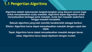 Dokumen ini menjelaskan konsep dasar algoritma pemrograman, mulai dari pengertian, langkah penggunaan, hingga notasi algoritma seperti deskriptif, pseudocode, dan flowchart. Algoritma yang baik memiliki karakteristik efisien, tepat, dan jelas, serta dapat diterapkan dalam berbagai masalah. Selain itu, dokumen juga menyertakan contoh algoritma dan dibandingkan antara berbagai notasi untuk pemrograman.