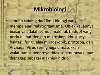 Dokumen tersebut membahas tentang pemusnahan sampel mikrobiologi. Sampel-sampel seperti urin, darah, feses, pus, sputum, dan sekret vagina yang telah digunakan untuk analisis mikrobiologi akan dimusnahkan dengan cara dibuang ke wastafel sambil dialiri air atau ditimbun di tempat khusus. Sediaan atau media kultur yang telah digunakan akan dimusnahkan dengan cara direndam dalam larutan desinfektan sepert