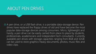 A pen drive, also known as a USB flash drive, is a portable storage device that plugs into a USB port. It has replaced floppy disks and become a popular way for students, professionals, and others to easily store and transfer files, photos, music, and videos between computers. Pen drives were introduced in 1999 and began being commercially sold in 2000, with early models having 8MB of storage. Storage capacity has since increased dramatically, with some modern pen drives offering 1TB of space. Pen drives work by using a small circuit board and microchip to extract and store data with low power from the USB connection. They are used to transport personal data between devices, help repair computers, aid system administrators, carry applications