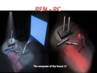 This document describes a pen-style computing device called P-ISM that allows for ubiquitous computing. It functions as a portable personal computer through a pen that acts as a CPU and projects a keyboard and monitor on any flat surface. The pen connects to the internet via Bluetooth and cellular connectivity and includes features like a digital camera, battery, and virtual laser keyboard. The document discusses the product, pricing, placement, target audience and merits and demerits of this novel pen-based computing device.