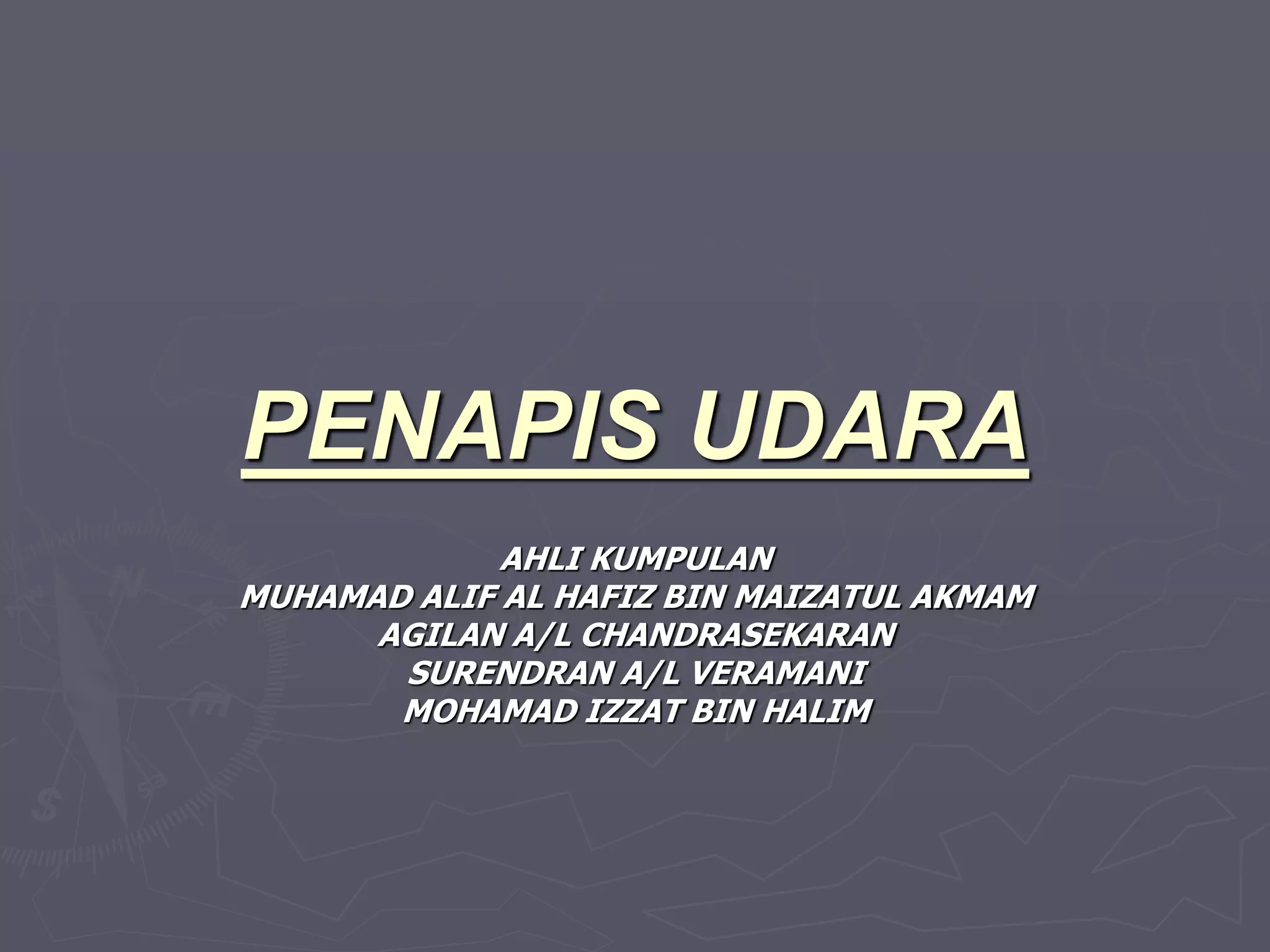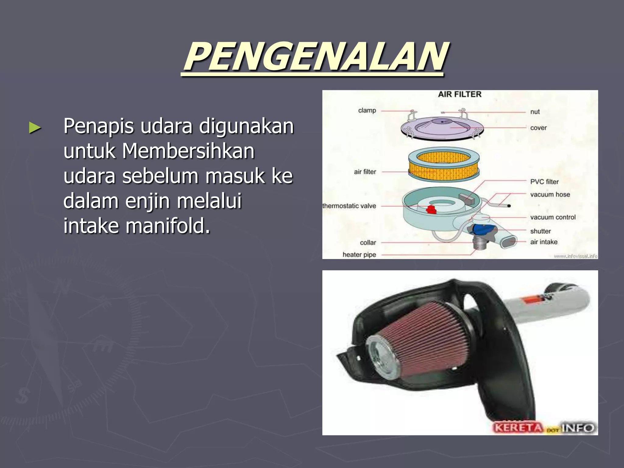 Dokumen ini membahas tentang penapis udara yang berfungsi membersihkan udara sebelum masuk ke enjin, serta mengurangi kelajuan udara untuk menjimatkan bahan api dan melindungi enjin dari percikan voltan tinggi. Terdapat empat jenis penapis udara yang biasa digunakan: jenis basahan minyak, jenis rendaman minyak, jenis katrej, dan jenis getah foam, masing-masing dengan cara penyelenggaraan tertentu. Keseluruhan, penapis udara sangat penting dalam sistem intake untuk meningkatkan kualiti dan melindungi enjin.