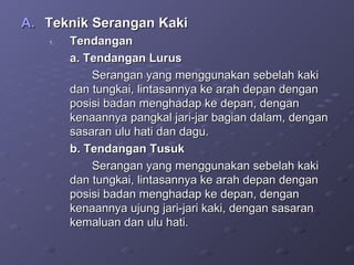 Dokumen ini menjelaskan standar kompetensi dalam pencak silat, termasuk teknik serangan kaki, sapuan, dan dengkulan. Selain itu, diuraikan tentang peraturan pertandingan, kategori umur, kelas pertandingan, perlengkapan gelanggang, serta ketentuan dan larangan bertanding. Penilaian dalam pertandingan juga dijelaskan berdasarkan berbagai kategori serangan dan teknik yang berhasil dilakukan.